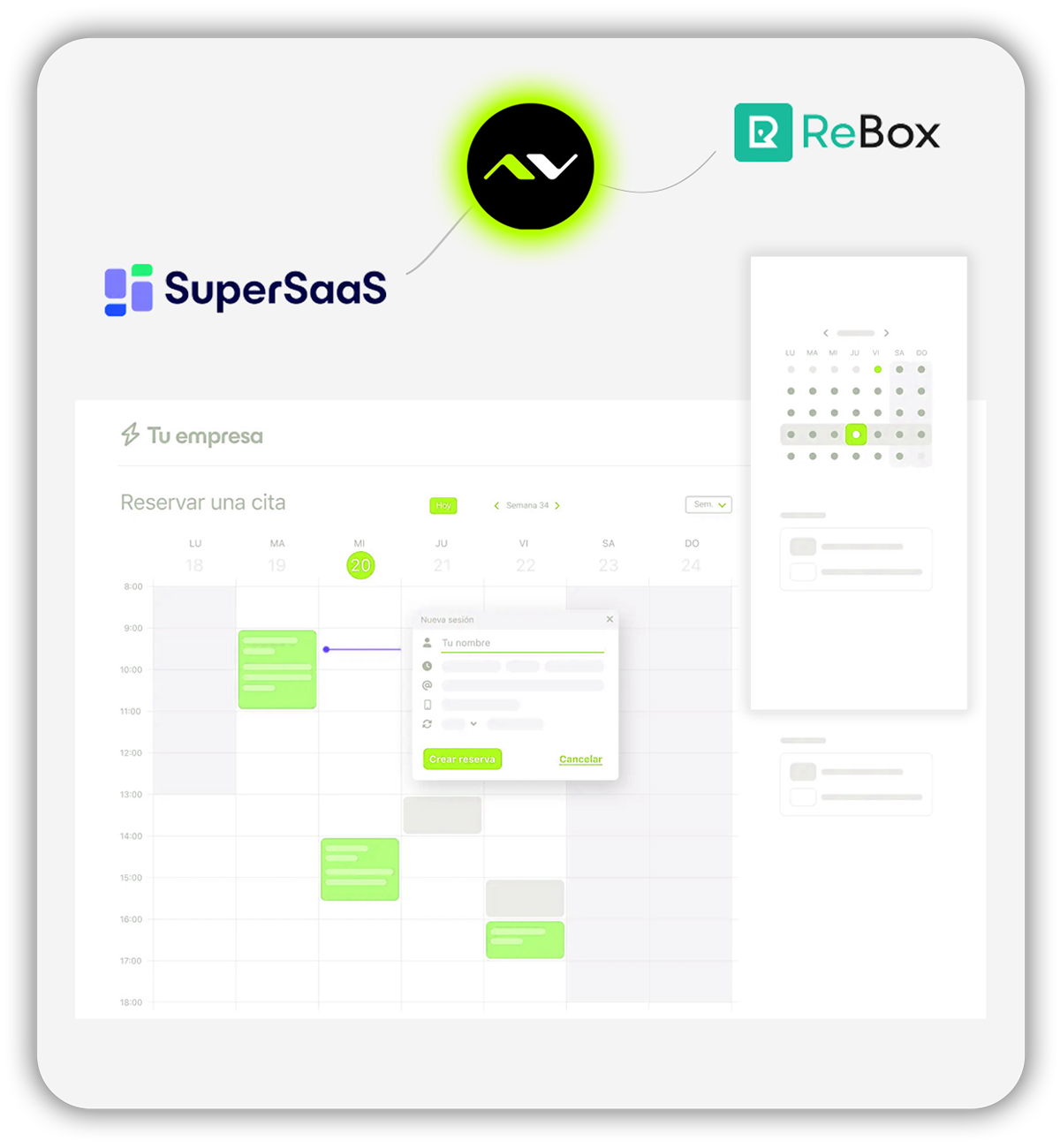 Nos integramos con SuperSaas y Rebox para que puedas mejorar tu atención al cliente, ofreciéndole la posibilidad de gestión de su reserva o cita desde el Whatsapp, sin hacerle perder el tiempo; todo de forma muy sencilla y rápida.